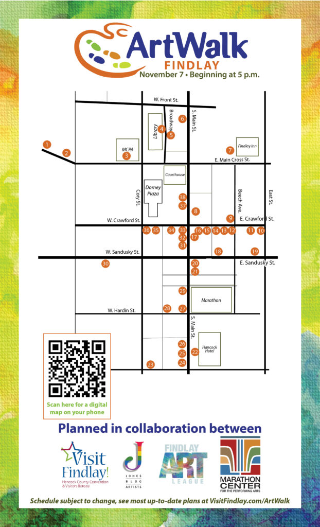 Artists will be located throughout Downtown Findlay in local shops, restaurants, and businesses as well as in our Downtown art anchors – Findlay Art League, Marathon Center for the Performing Arts, and Jones Building Artists Studios will be open.