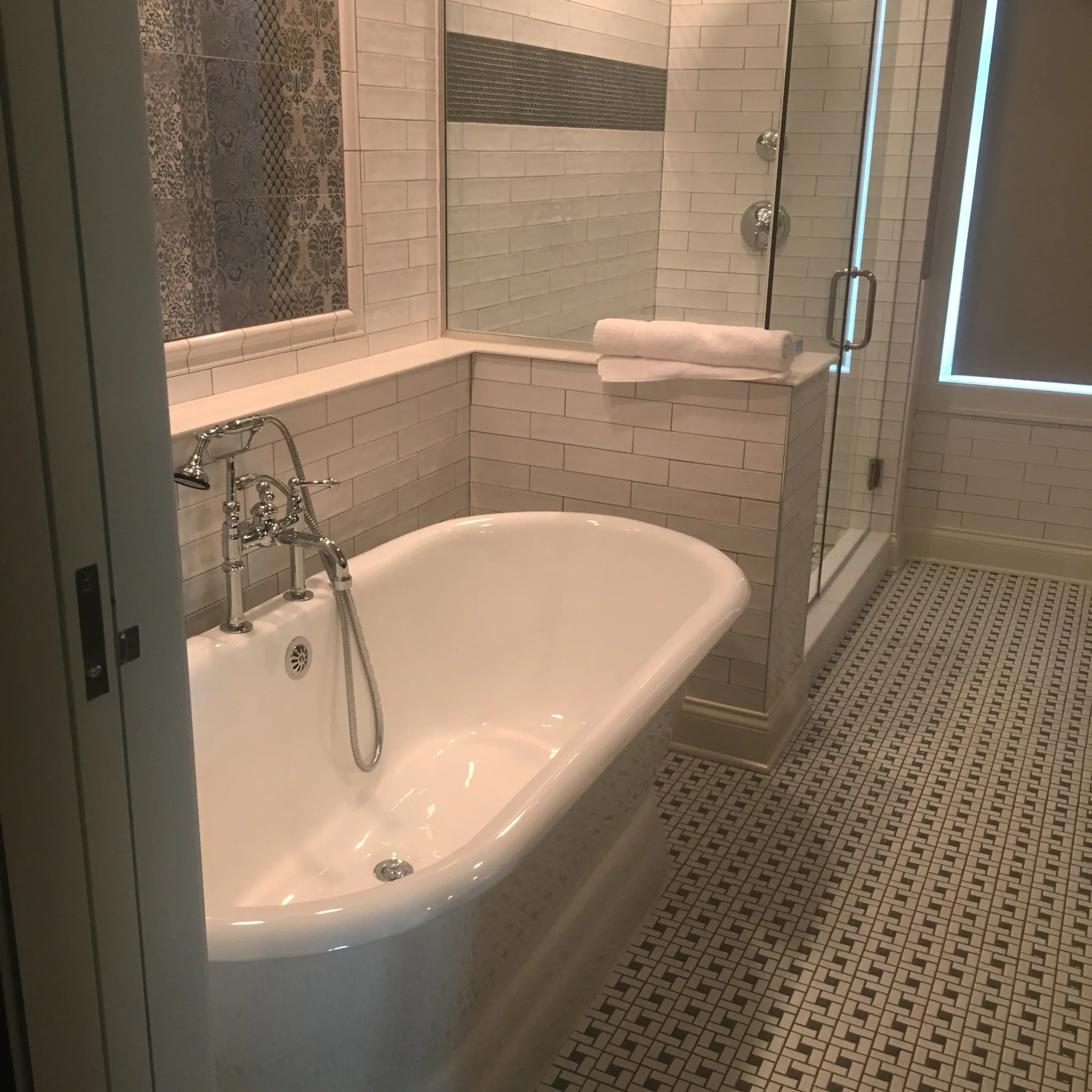 Our room was no different. We walked into a large sitting room with a nicely appointed kitchenette area. And sitting on the desk was treats from Dietsch Brothers to tempt us to purchase something from the minibar. We walked into the bedroom, and it was dominated by a wonderfully comfortable king-sized bed. Around the corner, we found a beautiful dressing area. And then we entered the most luxurious bathroom I had ever seen. Half of the left side was a bathtub that was just inviting me to sit in it with a glass of wine. The other half had a large shower. I was amazed that you could close the door and barely hear the water running. The double vanity was perfect for two people, like us, that cannot share.