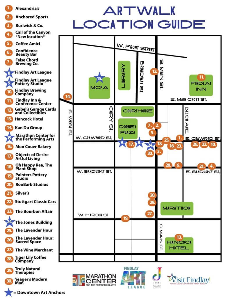 Artists will be located throughout Downtown Findlay in local shops, restaurants, and businesses as well as in our Downtown art anchors – Findlay Art League, Marathon Center for the Performing Arts, and Jones Building Artists Studios will be open.