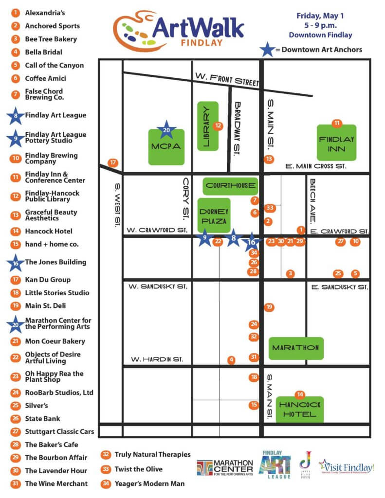 Artists will be located throughout Downtown Findlay in local shops, restaurants, and businesses as well as in our Downtown art anchors – Findlay Art League, Marathon Center for the Performing Arts, and Jones Building Artists Studios will be open.