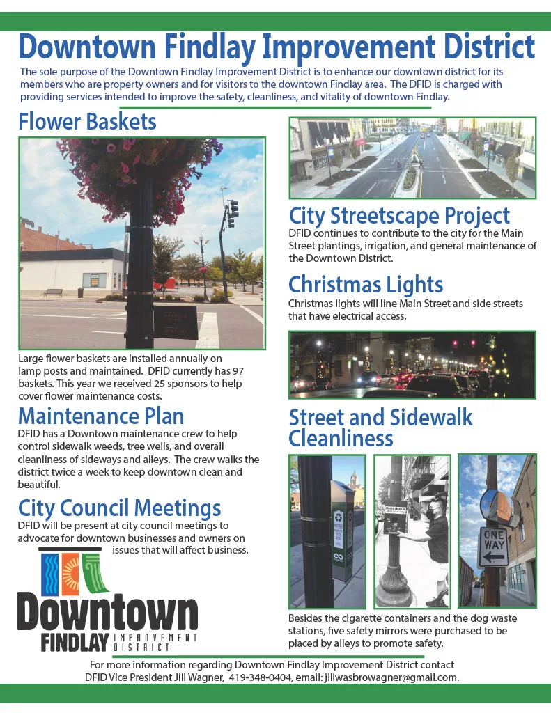 Downtown Findlay Improvement District is an organization with a sole purpose of enhancing the downtown district for its members who are property owners and for visitors to the downtown Findlay area. DFID is charged with providing services intended to improve the safety, cleanliness, and vitality of Downtown Findlay.