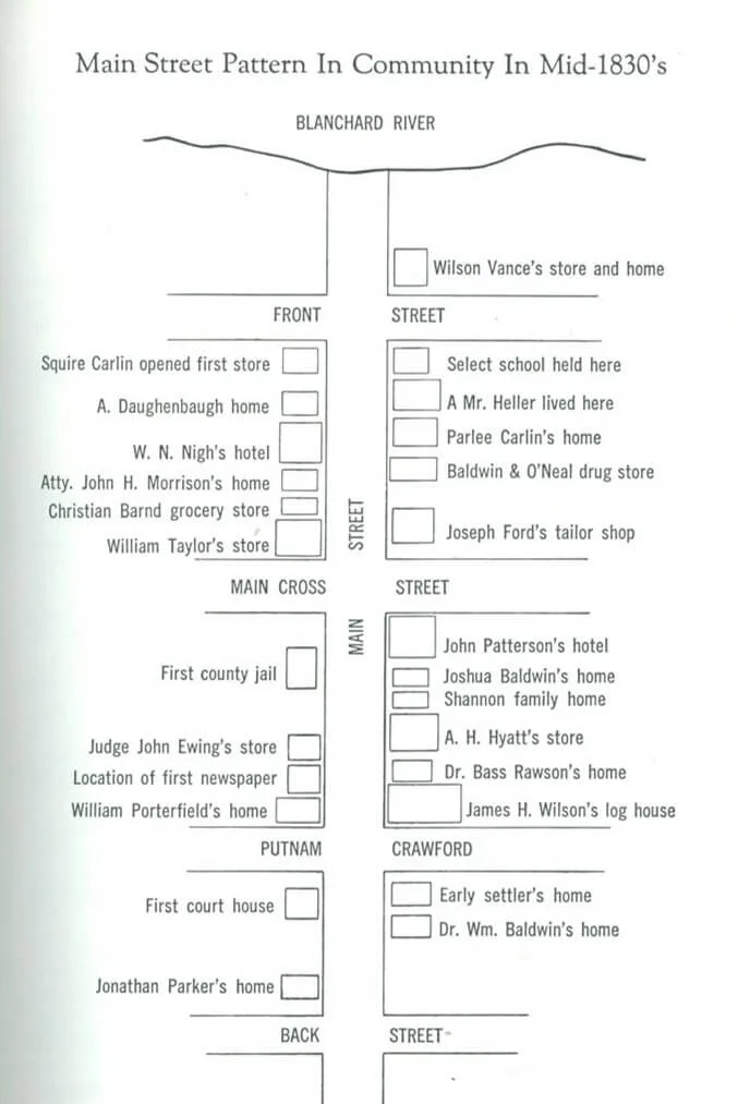 Wilson Vance was the next settler and he occupied the other block house. As more settlers arrived, they had to build their own shelters. There was a simplicity to the lives of the early settlers and they became used to a hard life with very few comforts. Food was not a problem as game was plentiful. Corn and potatoes were planted and a few families raised hogs. Wilson Vance was responsible for laying out the town of Findlay which contained less than one square mile. According to the plat he drew up, the town went north and south from Front to Back Street and east and west from East Main Street to West Main Street. (Back Street eventually became Sandusky Street. )
