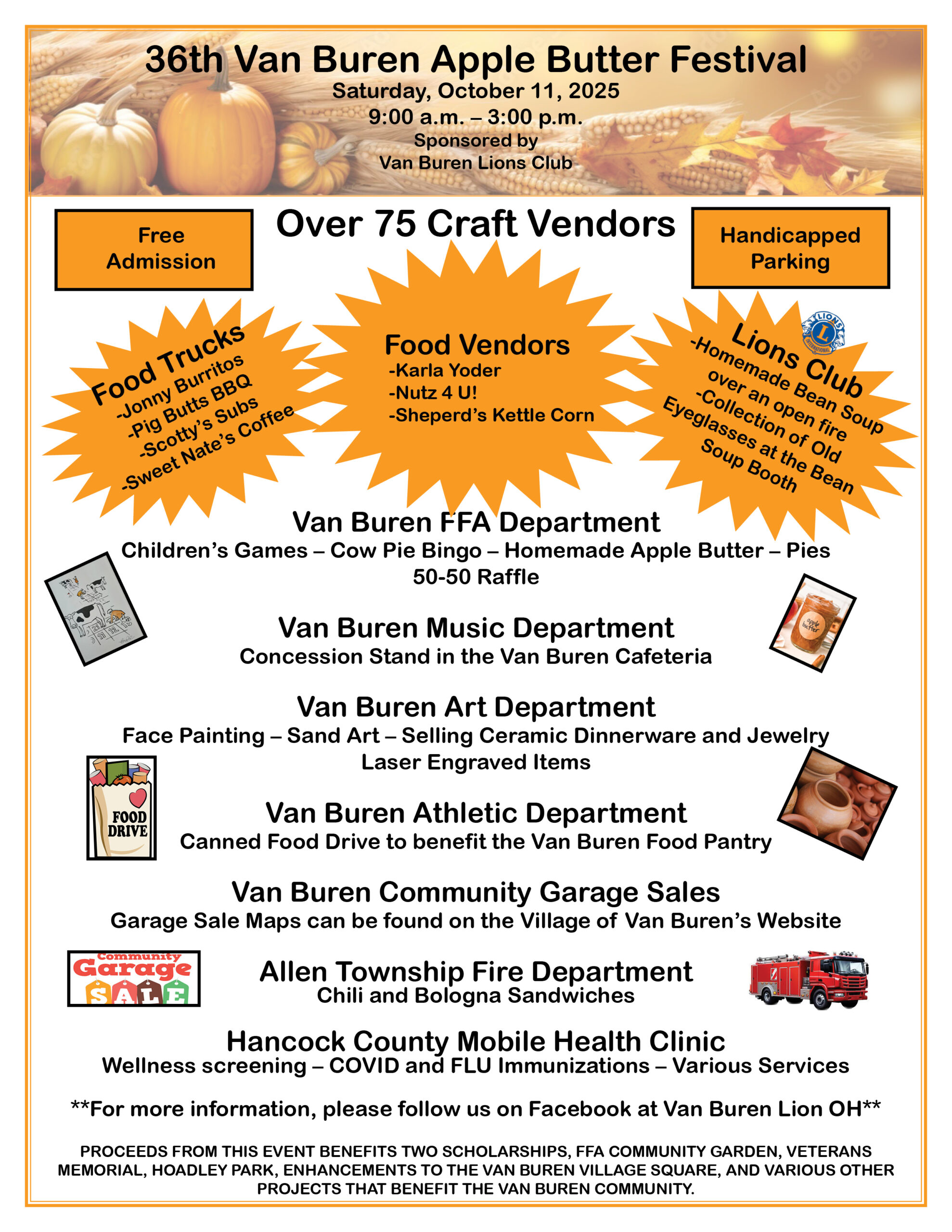 Don’t miss the 36th Van Buren Apple Butter Festival sponsored by the Van Buren Lions Club!