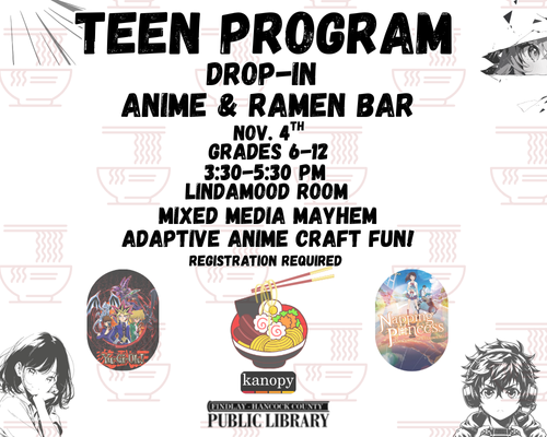 Findlay-Hancock County Public Library 206 Broadway, Findlay-Hancock Co Public LIbrary, OH, United StatesA welcoming space for teens with special needs to connect, create, and feel supported. If you are a long time anime fan or just curious about the style and culture, […]