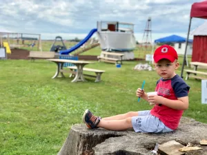 Inside the barn, there’s a corn filled pit where kiddos like using diggers to attempt to corral each grain. Or, they may use the pedal tractors along an indoor race track. The scent of “Aunt Sue’s” caramel apple slices waft our way and get us ready for the perfect fall snack. While we enjoy some of the fresh, gooey goodness, the boys hop into the lawnmower-pulled train of barrels for a trek around the farm.