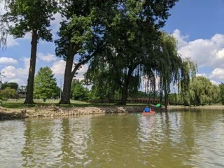 The river winds through the course and a beautiful channel, then along Riverside Park. The kids and I sometimes “dock” our kayaks at the little island near the waterfall and explore, usually to discover nesting geese and ducks who find our presence slightly alarming. We take a snack to eat on the island and relax.