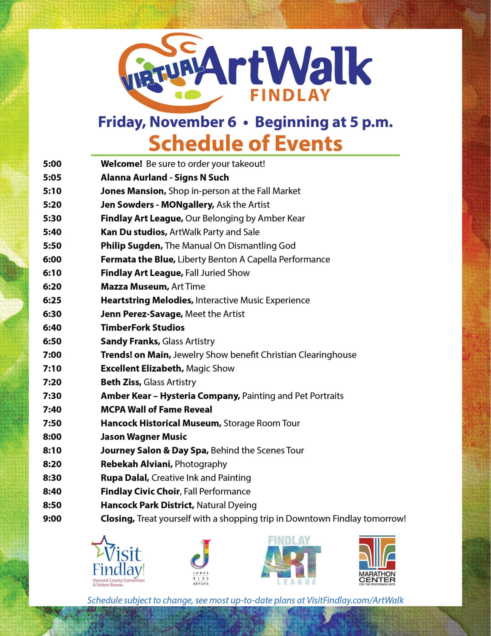 Just like regular ArtWalk the key to making the most of the event is to prepare! Check out which artists and organization’s segments you want to be sure not to miss at VisitFindlay.com/ArtWalk!