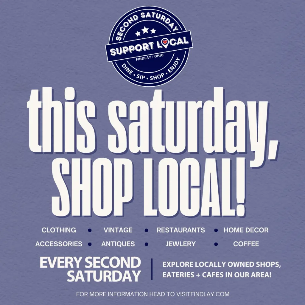 See our local shopping options in Findlay and Hancock County here. Check out each locations social media and website to see what they have in store for Second Saturday!