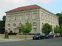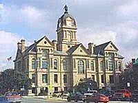 Hancock County Courthouse, 300 S. Main St., Findlay – The present courthouse building is the third to serve the county. Built in 1886-88 during the gas boom to accommodate a much increased population, it was extensively refurbished around its centennial. Topped by a large statue of John Hancock, after whom the county is named. Three muses over the front entrance represent Justice, Law and Mercy. The courthouse is adorned with glass windows, marble floors and an impressive rotunda. Public restrooms available.